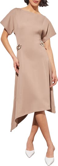 Polished chain-link hardware at the hips accentuates the flared silhouette of a midi dress complete with an asymmetric handkerchief hem.