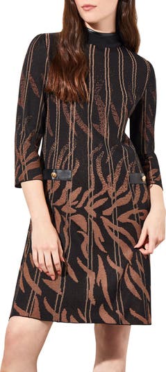 A shimmery metallic jacquard sweater-dress offers stunning style in an elegant shift silhouette framed by sleek faux-leather trim and gleaming buttons.