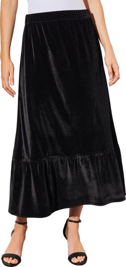 A comfy elastic waist tops this velvet midi skirt finished with a fluttery ruffle hem.