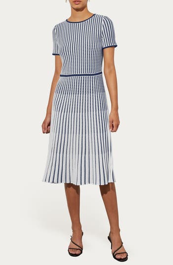 A knit dress resistant to wrinkles, fading and stretching is covered in grids and stripes for geometric flair in your desk-to-dinner ensemble.