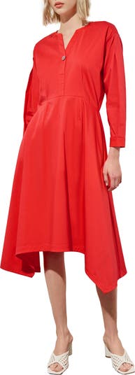 Asymmetric angles add a fabulous flounce to a siren-shaded dress cut from a cotton-forward blend.