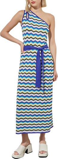 A one-shoulder dress comes with jazzy stripes and an optional sash that gives you more than one way to shape the silhouette.