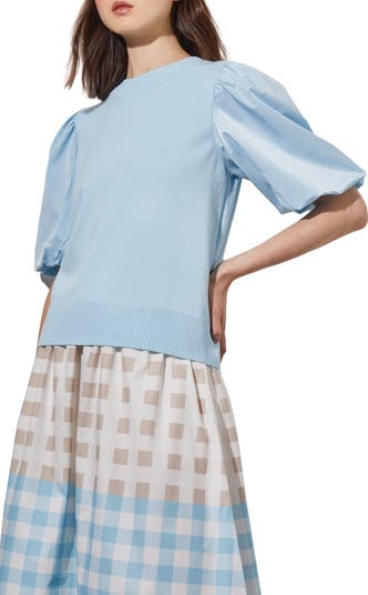 Taffeta puff sleeves further the mixed-media charm of this light and airy sweater knit with sustainably produced fibers.