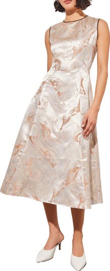 Fall for the timeless A-line silhouette of this satiny midi designed in a shimmering print with contrasting trim.