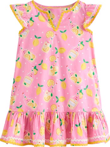 A flouncy hem and rickrack trim add to the exuberant personality of a breezy cotton beach dress rendered in a tangy lemonade print.