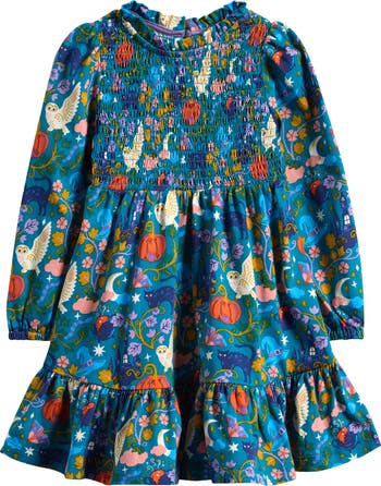 A smocked bodice and flouncy tier bring charm to an all-cotton dress covered in a whimsical print and framed by voluminous long sleeves.