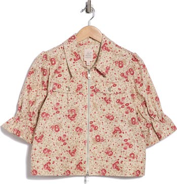 A pretty floral print boosts the charm of this cropped cotton-blend jacket framed by pretty puff sleeves and a two-way zip closure.