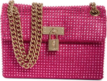 Shimmery rhinestone embellishments add a party-ready vibe to a structured bag that can be carried across your body or on your shoulder for versatile appeal.