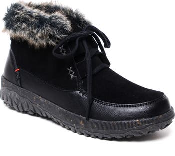 Triangle grooves on the tread enhance traction in this cozy lace-up boot finished with a warm fleece lining and a faux-fur cuff.