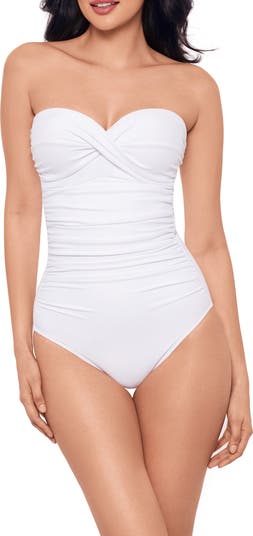 Look 10 pounds lighter in 10 seconds!® The flattering gathered front sculpts the silhouette of a perfectly polished strapless swimsuit that slims and supports while highlighting your curves.
