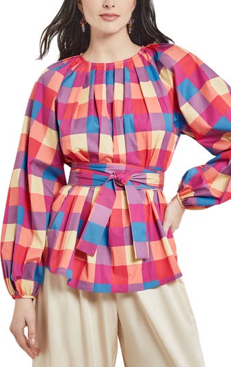 A pleated neckline and sash add an extra dimension of sophistication to this colorful checked top.