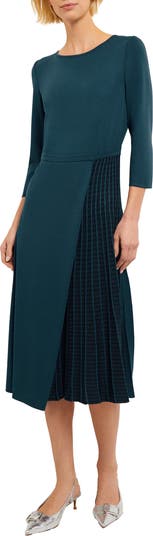 This wrinkle-resistant dress features a swirling pleated skirt modernized with a contrasting panel.
