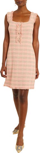 Pearly buttons shine from a textural knit dress fashioned in a perfectly polished A-line silhouette with wide straps and dainty fringed trim.