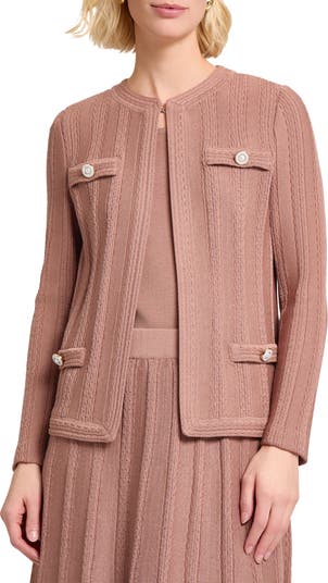 Refresh your work day essentials or polish up your weekend ensembles with this soft knit jacket finished with cable stitches and faux pockets.