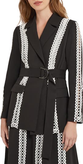 Hand-sewn eyelet stripes play up the vintage sophistication of this look-defining jacket with a D-ring belt.