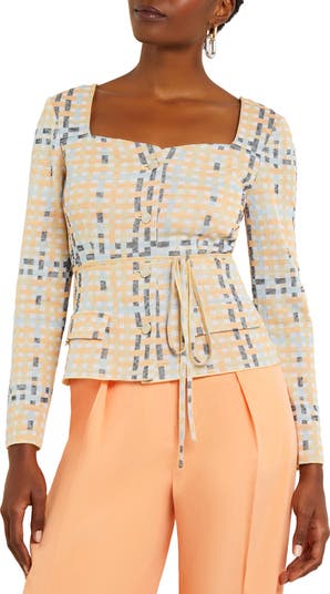 Muted hues and the sweetest of necklines defines this versatile jacket accented with a tie at the waist.