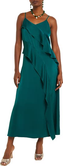 Move elegantly in this satiny slipdress accented with floaty ruffles.