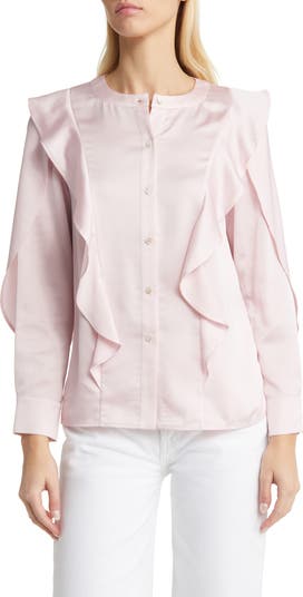 A petal-pink button-up blouse adds romantic charm with fluttering ruffles curving over the silhouette.