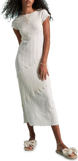 Multi-textured panels add boho flair to an everyday midi dress with a low scoop back.