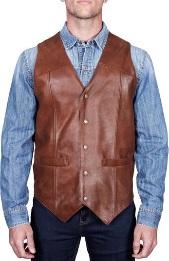 Vintage leather lends western-inspired style to this dapper vest fitted with welt pockets.