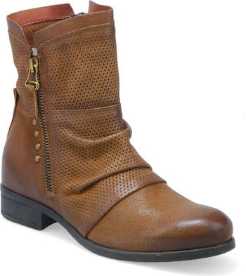 Burnishing on the toe lends lived-in flair to this scrunched boot featuring brassy hardware for rustic appeal and artful needlework for eye-catching texture.
