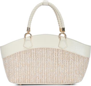 A contemporary colorblock design with raffia panels enhances the sunny-day vibe of a spacious tote bag that's perfect for casual days.