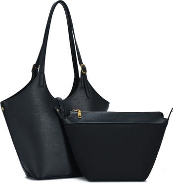 Spacious and structured, this sleek faux-leather tote features extralong top handles and a removable pouch for easy organization.