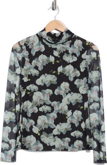 Keep it light and airy with this long-sleeve mock-neck top cut from orchid-patterned mesh, making it the perfect layering piece.