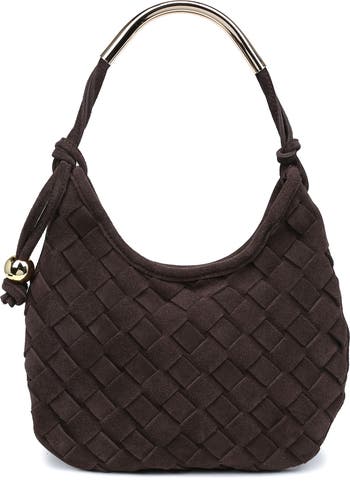 A woven texture lends depth and dimension to a modern shoulder bag crafted from buttery suede to elevate everyday looks.