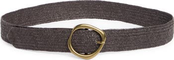 A brassy, molten-shaped buckle adds a shining finish to this straw belt that elevates any sunny-weather look.