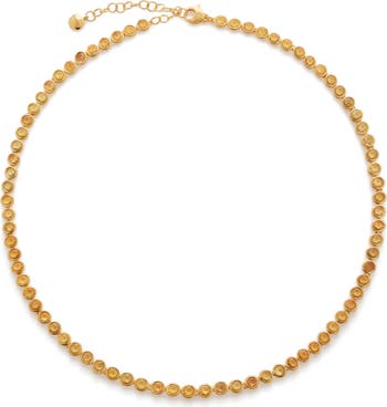 An 18-karat gold vermeil tennis necklace designed in collaboration with celebrity stylist Kate Young brings a burst of color with dainty bezel-set stones.