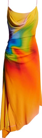 The design duo's passion for impeccable tailoring with a deconstructed perspective shines in this artfully ruched and draped slipdress shaped with rigid boning. A vivid rainbow pattern inspired by the beauty of orchids highlights the asymmetric hemline and daringly low-dipped back.