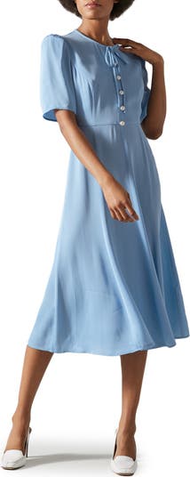 A dainty tie bow and pearly baubles highlight this graceful flutter-sleeve midi dress cut in a subtle A-line silhouette for charming style.