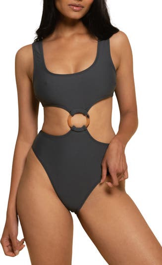 A ring embellishment and quick-drying fabric elevate this cutout one-piece swimsuit finished with moderate back coverage.