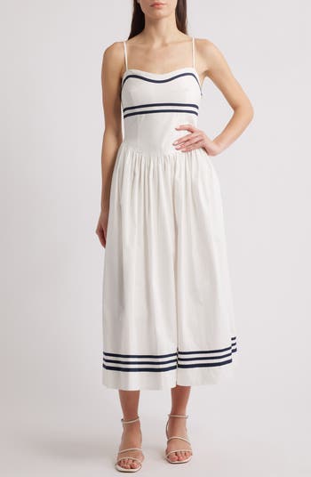 Bold stripes contrast a summery sleeveless maxi made from crisp poplin and punctuated with a breezy flared skirt. A smocked back enables easy movement while also shaping this sweet silhouette.