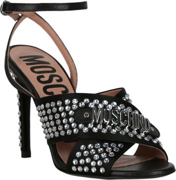 Logo hardware adds a sophisticated flourish to a strappy sandal crafted from crystal-embellished satin.