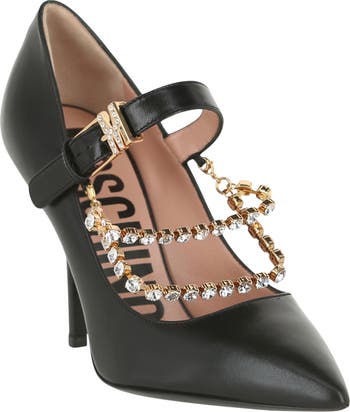 Bring some glam and sparkle to your evening looks with this pointed-toe pump fashioned with removable crystal chains and detailed with a signature pavé logo buckle.