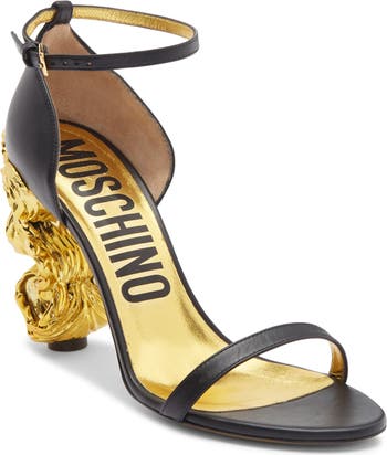 The Italian label continues to subvert traditional expectations with its signature blend of glamour and whimsy with this minimalist ankle-strap sandal transformed into wearable art with its sculpted baroque heel in a gilded finish.