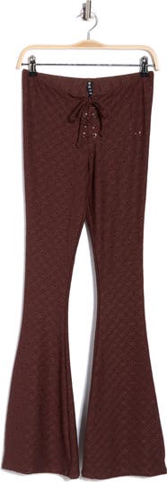 Airy eyelet stitching lends on-trend appeal to flared pants secured by a lace-up fly for added allure.