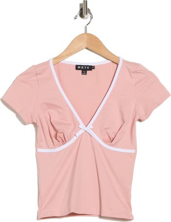 A dainty bow and contrast ribbons frame the neckline and bust of a figure-fitted short sleeve top made from a strech-kissed cotton.