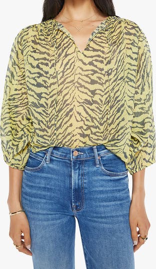 A sweeping curved hem and split neck with optional ties give easy movement to this pure-cotton top rendered in an eye-catching print.