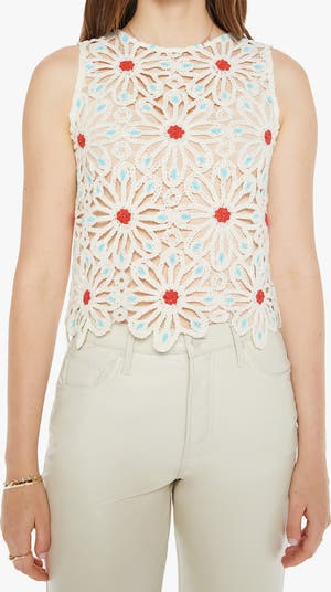 Lacy cutout blooms romance this close-fitting sleeveless top punctuated with a sweet scalloped hem.