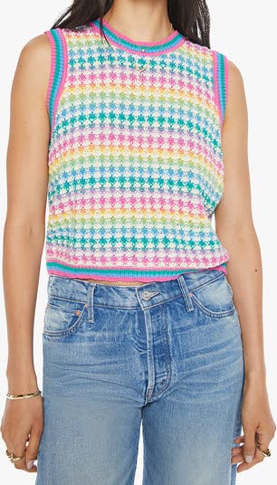 Rainbow-patterned stripes bring a cheerful vibe to this soft sweater-tank updated with an airy open back and a drapey tie closure.