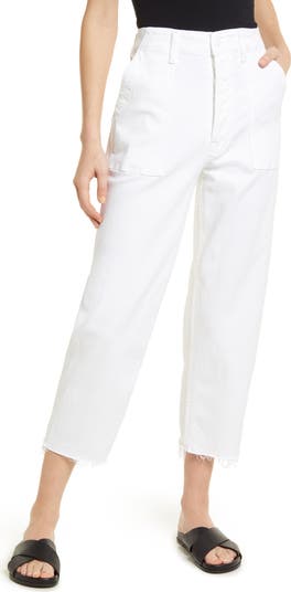 Oversize patch pockets and frayed hems bring candid charm to these high-waist jeans cut from a serene cotton blend.