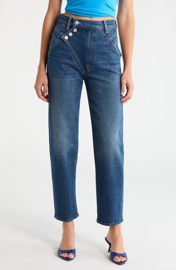 An asymmetric button fly and angular seams bring contemporary styling to these skinny jeans cut from dark-washed stretch-kissed denim.