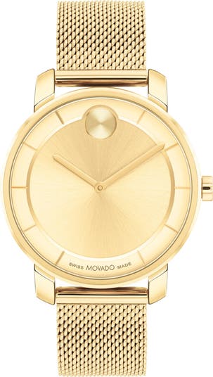 Gleaming hands and the iconic Museum dot bring a bold touch to the gold dial of this Swiss timepiece finished with a refined mesh bracelet.
