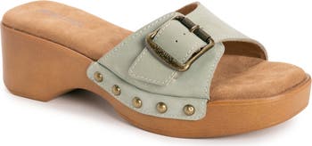 Designed for all‑day wear on sunny days, this leather sandal is set on an arch‑supporting foam insole and finished with a metal buckle.
