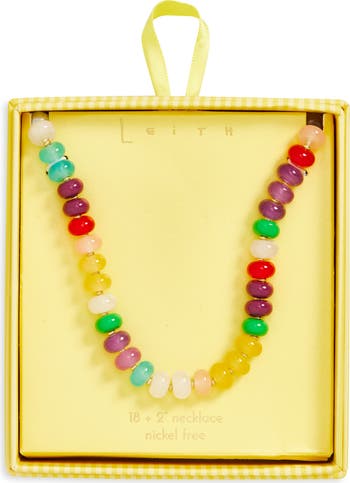 Brighten your day with this colorful collar necklace traced by polished glass and stone beads.