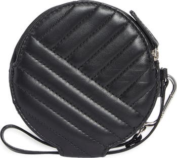 Geometric quilting enhances the charm of this round wristlet wallet fashioned in a bifold silhouette with a zip pocket and interior card slots.