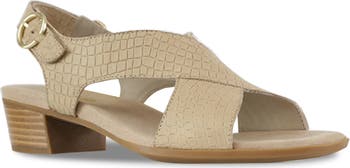Lizard-embossed nubuck leather distinguishes a strappy slingback sandal set on a low block heel.